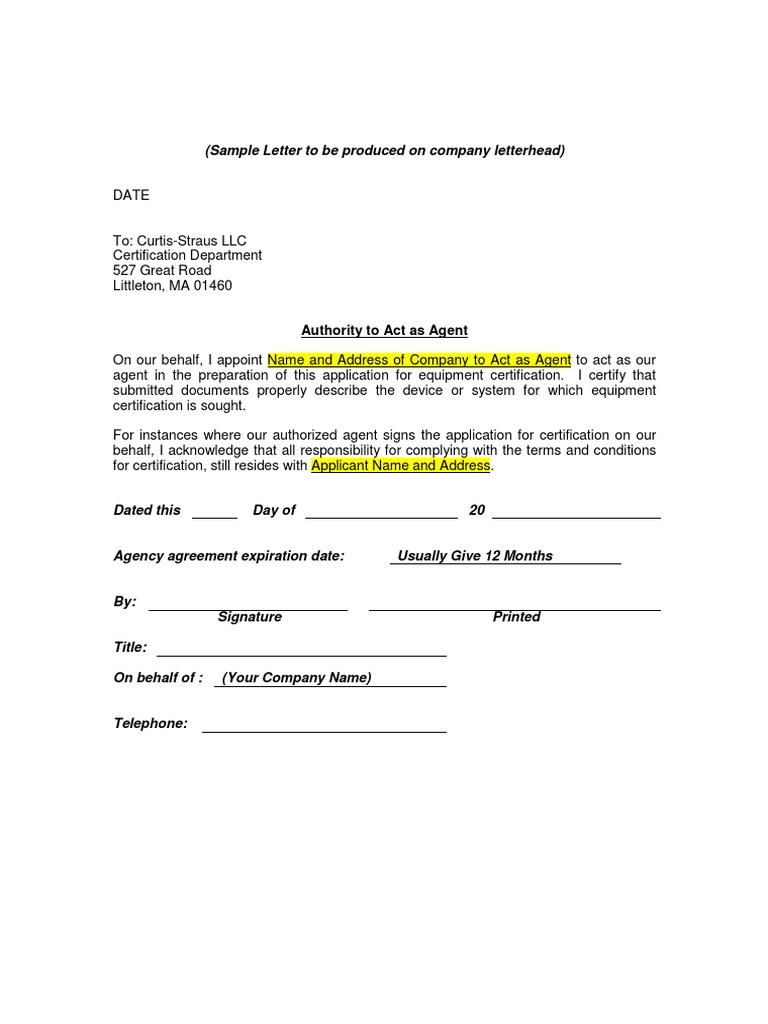 (Sample Letter To Be Produced On Company Letterhead) Authority To Act